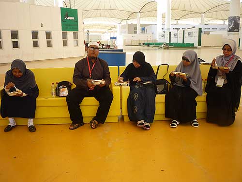 Sampai di luar Terminal Haji Jeddah, kami turunkan barangan kami. Nampak ramai pekerja terminal berbaju merah cuba menawarkan troli untuk mengangkat barangan kami. Namun isteri dan anakku telah cari troli dalam bangunan terminal. Nasib baik dapat dan tidak terima tawaran pekerja tadi. Sebab kalau ikutkan dia, beri troli saya SR 10 dan angkatkan barangan ke atas troli harga lain pulak.