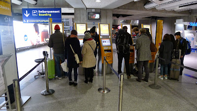 Orang telah ramai berator. Aku cuba check-in dengan kiosk yang digunakan seperti orang lain, tetapi ada masalah lalu terus sahaja ke kaunternya. Aku rasa scanner dia tak boleh baca passport aku bila diminta untuk scan.